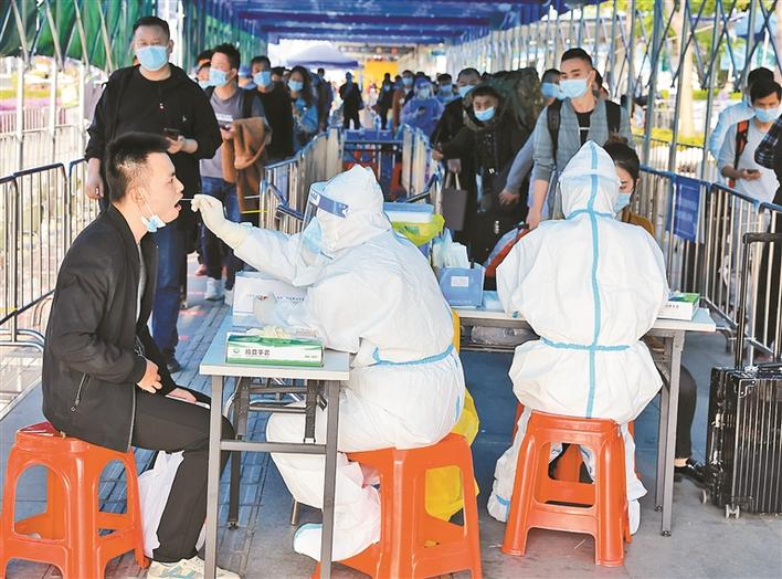 ▲10月25日,在深圳北站出站口,剛剛抵達(dá)深圳的旅客排隊(duì)接受免費(fèi)核酸檢測。深圳晚報(bào)記者 陳玉攝