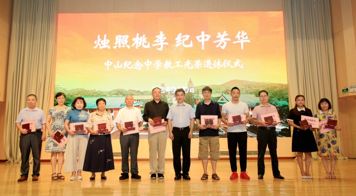 2021年9月10日,第37個(gè)教師節(jié),中山紀(jì)念中學(xué)在音樂廳召開全體教工大會(huì),為25位退休教工舉行集體歡送儀式。
